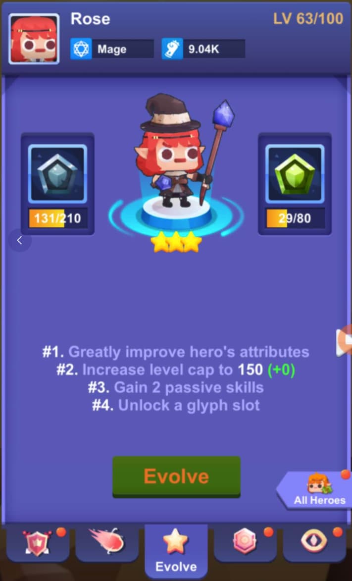 进化英雄将提升他们的属性,解锁额外的被动技能槽,增加等级上限,甚至进化到具有强大技能的高级职业!石头从睡前奖励宝箱中获得!